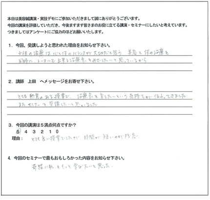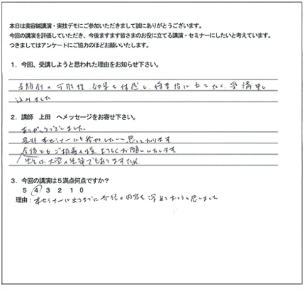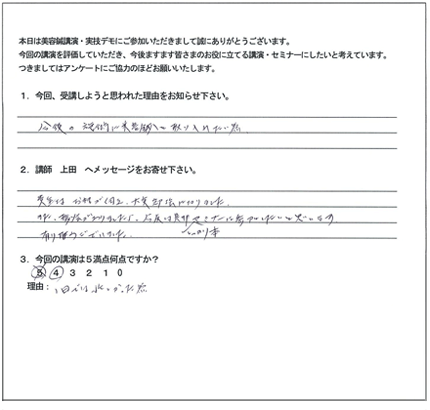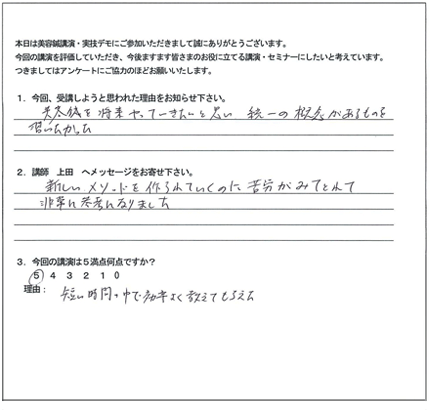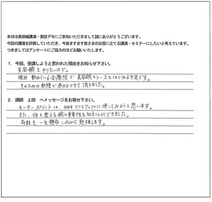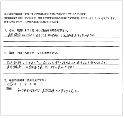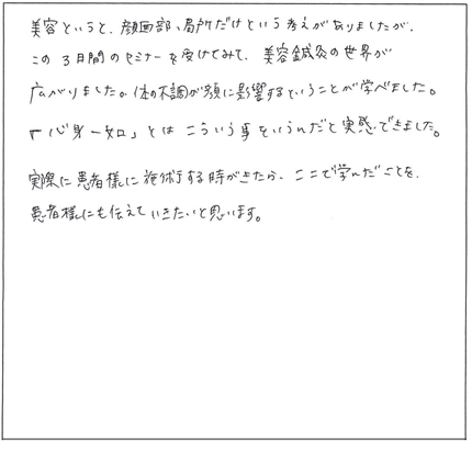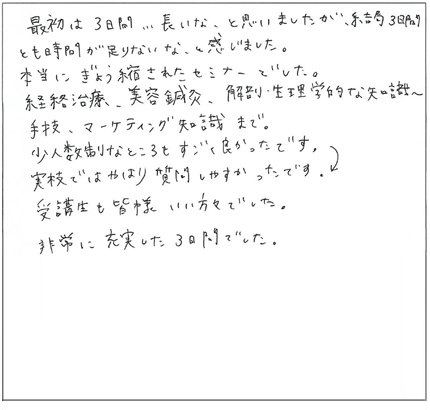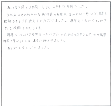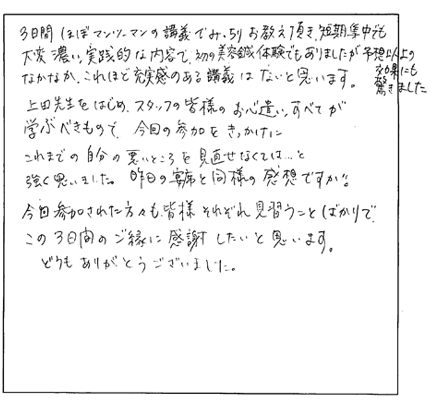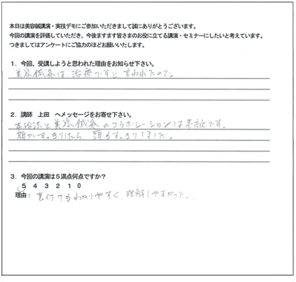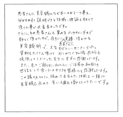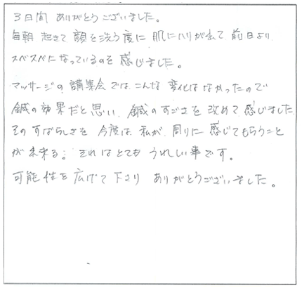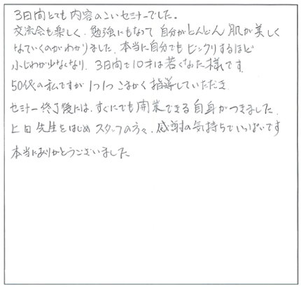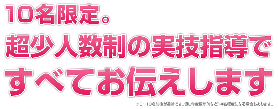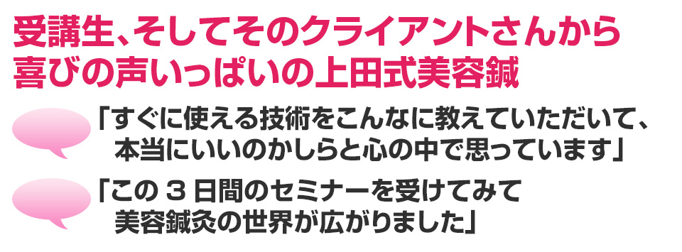 この特殊な方法こそ、クライアントに満足だけでなく「感動」と「リピート」を引き起こす技術の集大成なのです。今まで頑張って施術してもリピートが無かった方でも、たったの3日間で、クライアントからたくさんの喜びの声と「ありがとう」がもらえる、ただ一つのノウハウです。