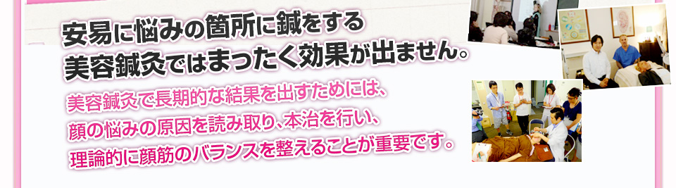 さらに日本の優しい伝統的な鍼灸手技が加わり本物のテクニック、顔鍼だけではない、顔のシワやニキビの位置などで体や心の状態を診断し、本治で治療していく本物の「美容鍼」。